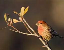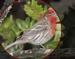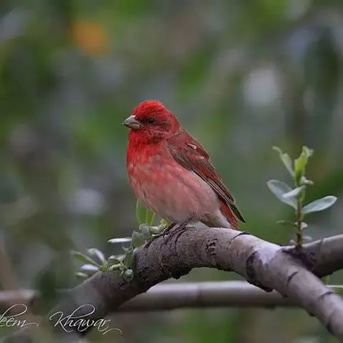 红腰朱雀:体长12-14厘米,小型鸟类。雄鸟前额和眉纹玫瑰粉红色,头顶和一宽的贯眼带深红褐色,背红…