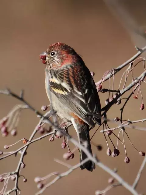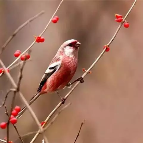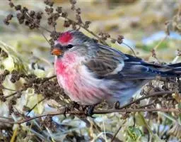 北朱雀,是燕雀科朱雀属鸟类。雄鸟额和头顶前部珠白色具窄的粉红色羽缘,…