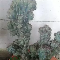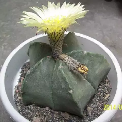 多年生肉质植物,茎幼时球形,后随年龄增长渐变为圆筒形,直径20cm,高可达5m以上,易群生,蓝绿色,棱11—15。茎 顶密生绒毛。刺座密集,放射状刺12—15,毛状,黄白色,中刺8—12,针状,褐色。两种刺长均为约0.5cm—0.8cm。花大,直径达5cm—6cm,花冠漏斗状,鹅黄色。花期6—7月。