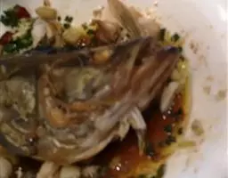 4.将火开大,放入拍好的蒜瓣儿和姜片儿,出香味后,将鱼头鱼排入锅;翻炒两下,倒入料酒约一小碗,盐半调羹,加沸水三四碗;等鱼头汤沸腾出味,将鱼片一片一片平放到出水滚的汤中;鱼片会熟的很快,出锅前放入适量鸡精,白胡椒粉和椒盐粉。
