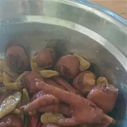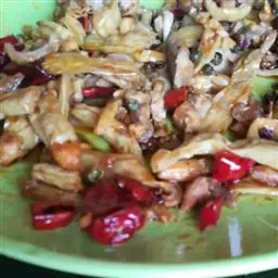 5.辣椒颜色快变时,立即关火,把锅中的油及花椒辣椒一起倒入盛鱼的大盆中。