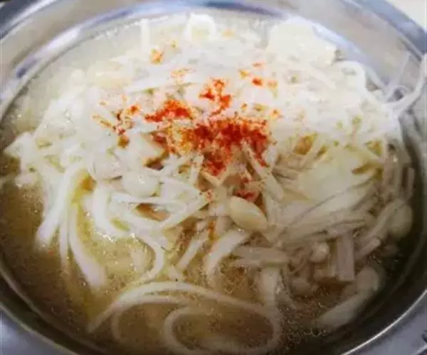 9.水开后,用筷子逐片将鱼片下锅,将煮好的鱼片倒入装黄豆芽的容器中,上面撒上蒜蓉和花椒碎。