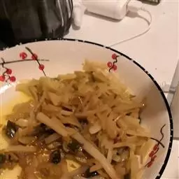 5.盆中放着已焯好的黄豆芽;将鱼片一系列汤汤水水倒入此盆;最后将那半碗捞出的辣椒和油倒在上面。