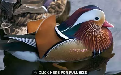林鸳鸯体长47-54厘米,翼展66-75厘米,雄性体重544 - 862克,雌性体重499 - 862克,雌、雄羽色差异大,雄鸭鲜艳(尤其在繁殖季节)、雌鸭朴素。雄雌均具独特羽冠(夏羽无羽冠)。雄鸟羽冠有两条纵列的白色条纹,头紫色和绿色相间,胸红褐色有白斑,两肋青铜色。雌鸟羽毛上有白色眼环,体羽为煤灰色,喉白色,胸部有白色条纹。幼鸟的羽毛颜色上黑下白,与一般的鸭子的黄色幼鸟截然不同。