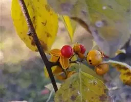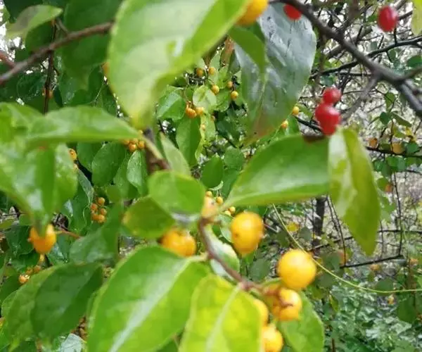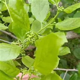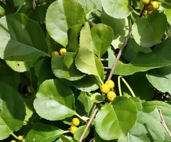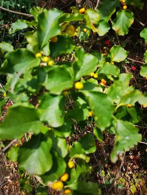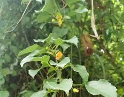 南蛇藤(学名:Celastrus orbiculatus Thunb.):卫矛科南蛇藤属落叶藤状灌木。小枝光滑无毛,灰棕色或棕褐色,腋芽小,卵状到卵圆状,叶通常阔倒卵形,近圆形或长方椭圆形,边缘具锯齿,两面光滑无毛或叶背脉上具稀疏短柔毛,聚伞花序腋生,花小,雄花萼片钝三角形;花瓣倒卵椭圆形或长方形,花盘浅杯状,雌花花冠较雄花窄小,肉质,子房近球状,蒴果近球状,种子椭圆状稍扁,赤褐色。5-6月开花,7-10月结果。
