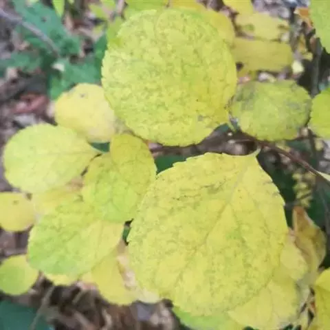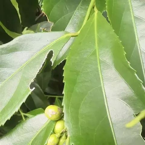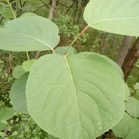 叶通常阔倒卵形,近圆形或长方椭圆形,长5-13厘米,宽3-9厘米,先端圆阔,具有小尖头或短渐尖,基部阔楔形到近钝圆形,边缘具锯齿,两面光滑无毛或叶背脉上具稀疏短柔毛,侧脉3-5对;叶柄细长1-2厘米。