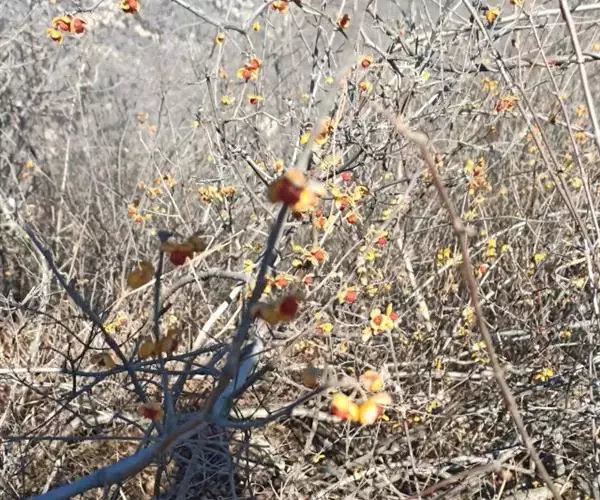 南蛇藤在藤本植物中属大型藤本植物,以周边植物或山体岩石为攀援对象,远望形似一条莽蛇在林间、岩石上爬行,蜿蜒曲折,野趣横生。