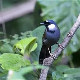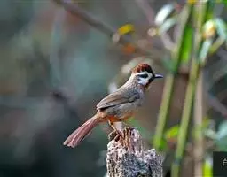 黑顶噪鹛:中型鸟类,体长24-26厘米。前额、脸、颏、喉黑色,头顶黑褐沾棕或深棕橄榄褐色,…