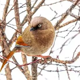 银耳相思鸟小型鸟类,体长14~18厘米。头顶黑色,耳羽银灰色,前额橙黄色;外侧飞羽橙黄色,基部朱红色,…