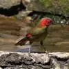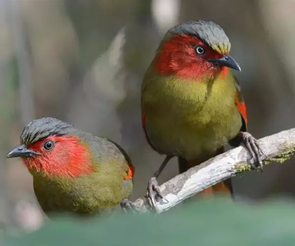 雌雄羽色相似。上体橄榄褐色或头顶灰褐色,上体橄榄褐色,眼先、颊、耳羽、头侧、颈侧深红色,眉纹黑色或红色。两翅覆羽同背,初级飞羽黑褐色,外翈基部赤红色,端部转为橙黄色;次级飞羽与初级相似,但外翈基部橄榄褐色,中段边缘淡灰色,端部边缘赤红色,末端淡白色;尾黑色,基部橄榄褐色具不甚清晰的淡黑色横斑和橙红色或赭色端斑,且愈往外侧尾羽端斑愈宽。颏淡红色,喉、胸深灰色而微缀黄褐色或为棕橄榄褐色,腹和两胁灰色沾褐或沾橄榄色。尾下覆羽基部黑色具红色端斑。