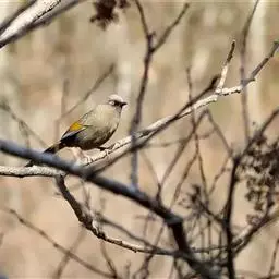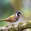 黄喉噪鹛体型略小,顶冠蓝灰色,特征为具黑色的眼罩和鲜黄色的喉。上体褐色,尾端黑色而具白色边缘,…