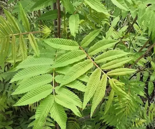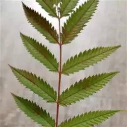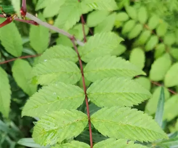 羽状复叶,小叶片11-17枚,连叶柄长13-23厘米,宽10-13厘米,叶轴微被短柔毛;小叶片对生,相距2-2.5厘米,披针形至卵状披针形,长5-7厘米,宽1.8-2.5厘米,先端渐尖,稀尾尖,基部近圆形或宽楔形,稀偏斜,边缘有尖锐重锯齿,上下两面无毛或近于无毛,羽状网脉,具侧脉12-16对,下面明显;小叶无柄或近于无柄;托叶叶质,卵状披针形至三角披针形,先端渐尖至急尖,边缘有不规则锯齿或全缘,长8-13毫米,宽5-8毫米,外面微被短柔毛。