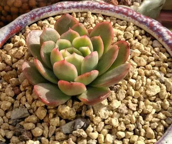 株高通常15厘米以内,叶排列紧凑,呈莲座状;叶肉质,匙形或长椭圆形,具明显的短叶尖,叶中绿,叶缘泛红或分红,叶尖部分颜色较深,内层叶片近直立,外侧叶片呈放射性生长,株型整体外观呈杯状;花茎自叶腋抽出,小花橙红或橙黄,倒钟形,先端外翻,盛开在冬春季节。