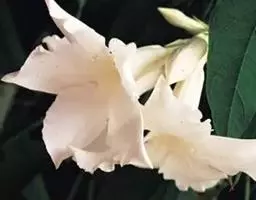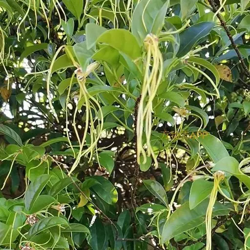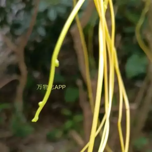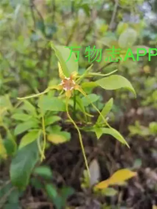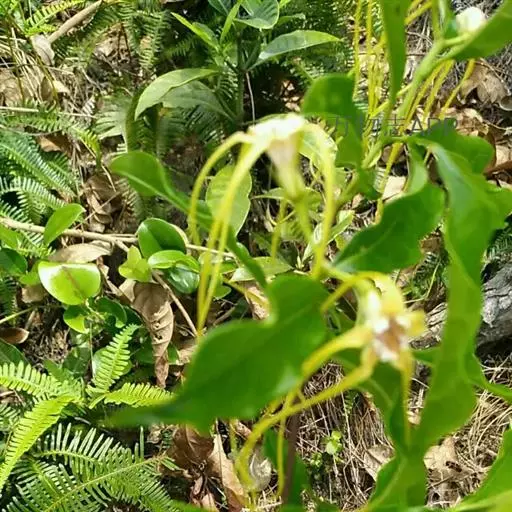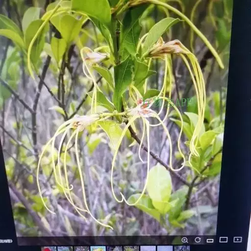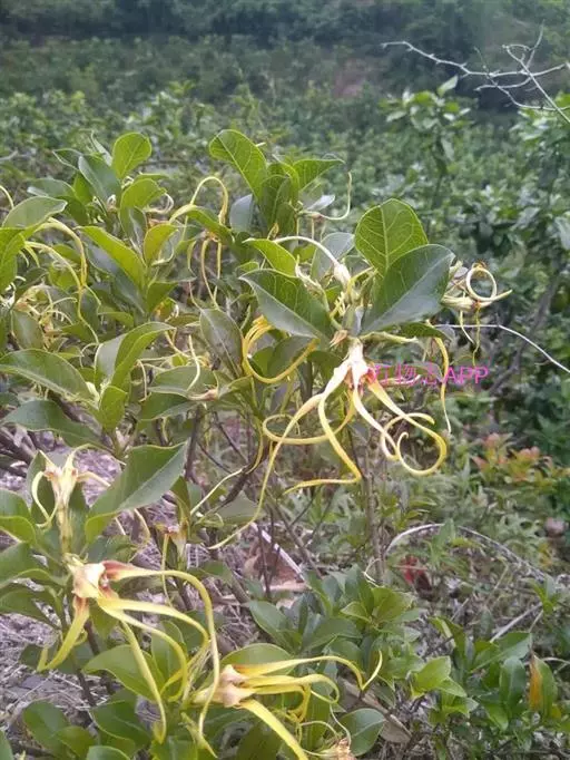 聚伞花序顶生,通常着花3朵,无毛;总花梗长0.51.5厘米;花梗长0.5-1厘米;苞片和小苞片线状披针形,长5-10毫米;花黄色;花萼筒长5毫米,萼片披针形,长8-9毫米,基部宽2毫米,顶端长渐尖,绿色或黄绿色,内面基部有腺体;花冠漏斗状,花冠筒淡黄色,长1.2-1.5厘米,下部圆筒状,上部渐扩大呈钟状,内面被疏短柔毛,花冠裂片黄色外弯,基部卵状披针形,顶端延长成一长尾带状,长达10厘米,基部宽0.4-0.5厘米,裂片内面具由10枚舌状鳞片组成的副花冠,高出花冠喉部,白黄色,鳞片每2枚基部合生,生于花冠裂片之间,顶部截形或微凹,长3毫米,宽1毫米;雄蕊内藏,着生在冠檐基部,花丝延长至花冠筒上呈肋状凸起,被短柔毛,花药箭头形,基部具耳,药隔顶部渐尖成一尾状体,不伸出花冠喉部,各药相连,腹部粘于柱头上;子房半下位,由2枚离生心皮组成,无毛,花柱圆柱状,柱头棍棒状,顶端浅裂,每心皮有胚珠多颗;无花盘。