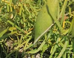 干燥种子呈纺锤形而扁,长约2厘米,宽约5毫米,基部钝,先端尖,顶部留有着白色丝状细长毛的痕迹,脐点在种毛附近的稍下方,种脊位于一侧,白色线状,微凸起,表面棕褐色,有纵纹,并微有扭曲。易折断,断面灰白色,角质,以手指挤压,有油脂溢出。