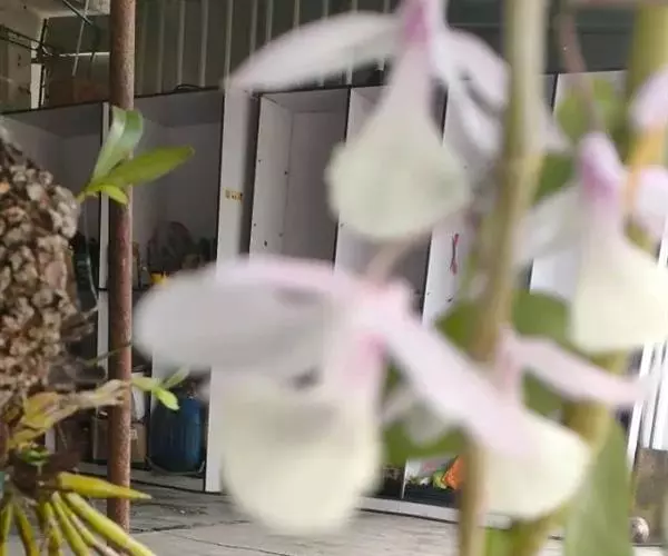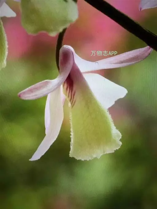 总状花序几乎无花序轴,每1-3朵花为一束,从落了叶或具叶的老茎上发出;花序柄长约2-5毫米,基部被3-4枚鞘;鞘膜质,长2-3毫米;花苞片浅白色,膜质,卵形,长约3毫米,先端急尖;花梗和子房暗褐色带绿色,长2-2.5厘米;花开展,下垂;萼片和花瓣白色带淡紫红色或浅紫红色的上部或有时全体淡紫红色;中萼片近披针形,长2.3厘米,宽5-6毫米,先端近锐尖,具5条脉;侧萼片相似于中萼片而等大,先端急尖,具5条脉,基部歪斜;萼囊狭圆锥形,长约5毫米,末端钝。