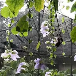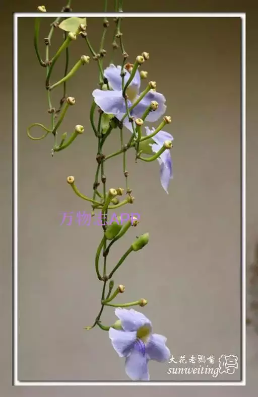每年的夏秋季,苏铁园入口的凉亭上,大花老鸦嘴成串大朵浅蓝色的花儿垂挂而下,编织成美丽的藤帘,如梦似幻。大花老鸦嘴(Thunbergia grandifloraRoxb.),又名大邓伯花、大花山牵牛,是爵床科(Acanthaceae)山牵牛属的常绿植物,原产孟加拉、泰国、印度、中国,广植于热带和亚热带地区。
