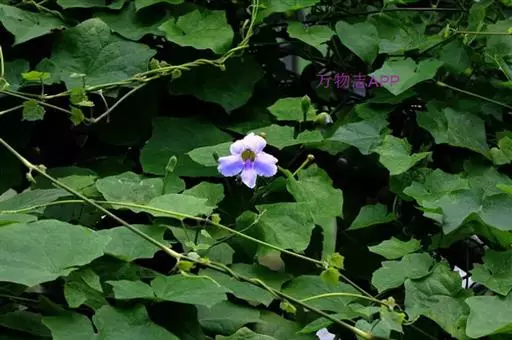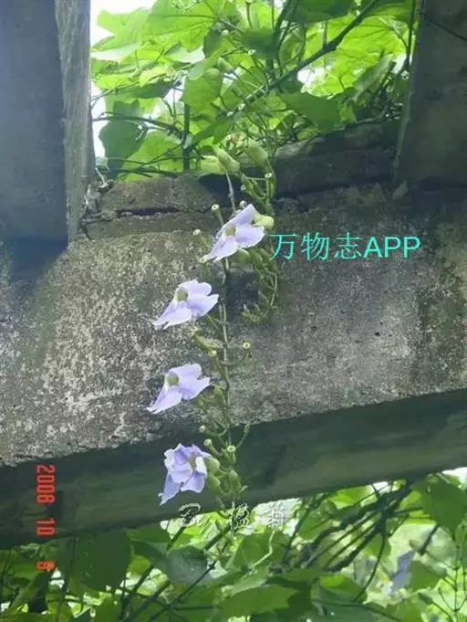 茎粗壮,长达7m以上,全株茎叶密被粗毛。叶厚,单叶对生,长12~18cm,阔卵形,具3~5条掌状脉,类似瓜叶,叶缘有角或浅裂,叶柄无翅。花大,腋生,有柄,多朵单生下垂成总状花序,花冠长5~8cm、径7cm;叶状苞片2枚,初合生,后一侧开裂成佛焰状苞片,有微毛;花萼退化,花冠漏斗状,初花蓝色,盛花浅蓝色,末花近白色。蒴果下部近球形,上部具长喙,开裂时似乌鸦嘴。花期7-10月,果期8-11月。