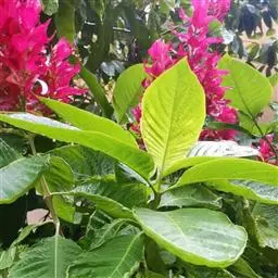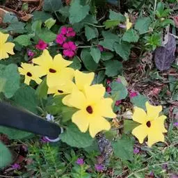 而在姜园里还有它同科同属的“亲戚”——硬枝老鸦嘴(T. erecta),又称蓝吊钟,常绿小灌木,花比大花老鸦嘴的小,蓝紫色,喉部杏黄色,更显娇艳。叶片小,分枝多,枝条较柔软。原产热带西部非洲,亚洲热带至马达加斯加非洲南部。