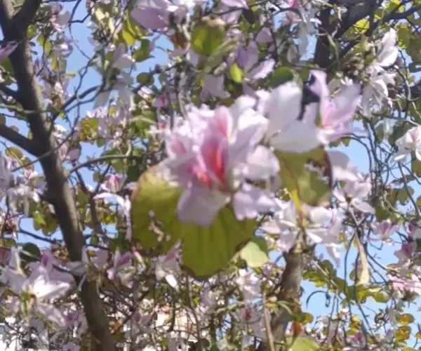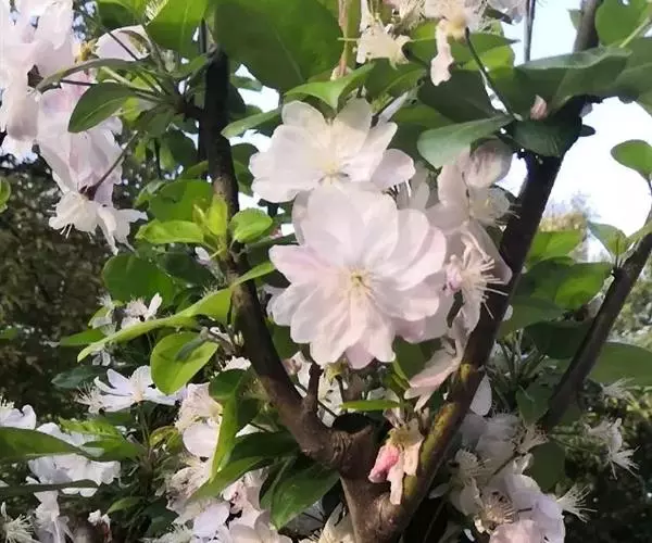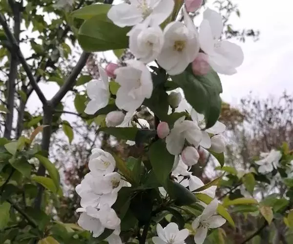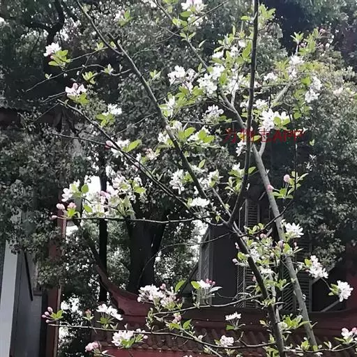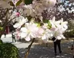 海棠花(学名:Malus spectabilis (Ait.)Borkh):乔木,高可达8米;小枝粗壮,圆柱形,幼时具短柔毛,逐渐脱落,老时红褐色或紫褐色,无毛。叶片椭圆形至长椭圆形,长5-8厘米,宽2-3厘米,边缘有紧贴细锯齿,有时部分近于全缘,幼嫩时上下两面具稀疏短柔毛,以后脱落,老叶无毛。花序近伞形,有花4-6朵,花直径4-5厘米;萼筒外面无毛或有白色绒毛;萼片三角卵形,先端急尖,全缘;花瓣卵形,长2-2.5厘米,宽1.5-2厘米,基部有短爪,白色,在芽中呈粉红色。果实近球形,直径2厘米,黄色。果期8-9月。