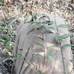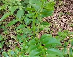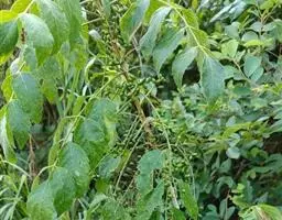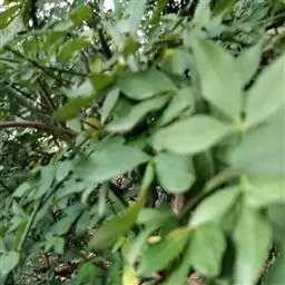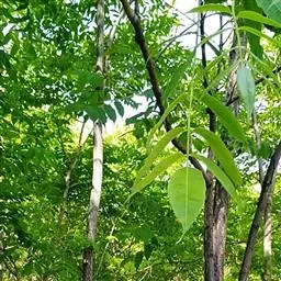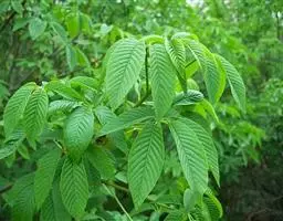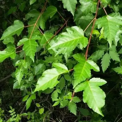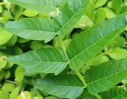 叶对生,叶轴长9-17厘米,淡灰褐色,无毛,小叶3,稀为5,纸质,长圆状椭圆形或长卵形,长(6~)8~10厘米,宽(2.5~) 3.5~4.5厘米,先端长渐尖,基部宽楔形,边缘微反折,具锯齿,上面深绿色,无毛,背面色淡,向基部脉腋(中脉两侧)疏生白色微柔毛,余无毛,主脉在两面明显,侧脉6~7,与网脉在两面明显,侧、叶柄长经尧望篡半,中、叶柄长(1~)2.5~3.5厘米。