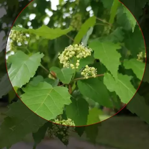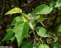 落叶灌木或小乔木,高5~6米。树皮粗糙、微纵裂,灰色,稀深灰色或灰褐色。小枝细瘦,近于圆柱形,无毛,当年生枝绿色或紫绿色,多年生枝淡黄色或黄褐色,皮孔椭圆形或近于圆形、淡白色。冬芽细小,淡褐色,鳞片8枚,近边缘具长柔毛,覆叠。叶纸质,基部圆形,截形或略近于心脏形,叶片长圆卵形或长圆椭圆形,长6~10厘米,宽4~6厘米,常较深的3-5裂;中央裂片锐尖或狭长锐尖,侧裂片通常钝尖,向前伸展,各裂片的边缘均具不整齐的钝尖锯齿,裂片间的凹缺钝尖;上面深绿色,无毛,下面淡绿色,近于无毛,主脉和侧脉均在下面较在上面为显著;叶柄长4~5厘米,细瘦,绿色或紫绿色,无毛。伞房花序长6厘米,无毛,具多数的花;花梗细瘦,长3~5厘米。花杂性,雄花与两性花同株;萼片5,卵形,黄绿色,外侧近边缘被长柔毛,长1.5~2毫米;花瓣5,长圆卵形白色,较长于萼片;雄蕊8,与花瓣近于等长,花丝无毛,花药黄色;花盘无毛,位于雄蕊外侧;子房密被长柔毛(在雄花中不发育);花.柱无毛,长3~4毫米,顶端2裂,柱头平展或反卷。果实黄绿色或黄褐色;小坚果嫩时被长柔毛,脉纹显著,长8毫米,宽5毫米;翅连同小坚果长2.5~3厘米,宽8~10毫米,中段较宽或两侧近于平行,张开近于直立或成锐角。花期5月,果期10月。