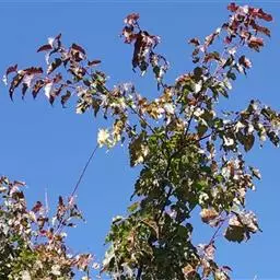枫树为高大乔木,可高达29米以上,冠幅可达16米。花期4到5月,果期9到10月。随着树龄增长,树冠逐渐敞开,呈圆形。枝条棕红色到棕色,有小孔,冬季枝条是黑棕色或灰色。枫叶色泽绚烂、形态别致优美,可制作书签、标本等。在秋天则变成火红色,落在地上时变成深红。