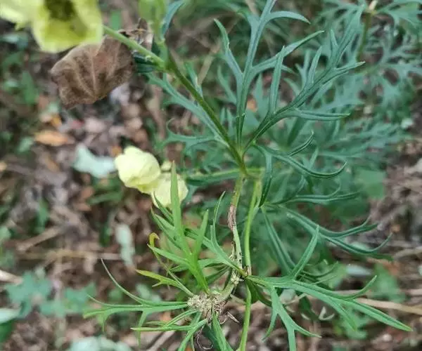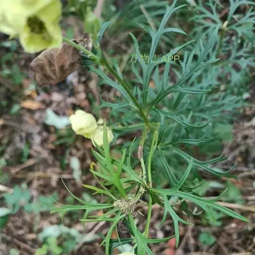 茎下部叶在开花时枯萎,中部叶具稍长柄;叶片宽菱状卵形,长4.2-6.4厘米,宽3.6-6.4厘米,三全裂,全裂片细裂,小裂片线形或线状披针形,干时边缘稍反卷,两面几无毛;叶柄长为叶片的1/4或比叶片稍短,长1.4-4.5厘米,无毛,具狭鞘。