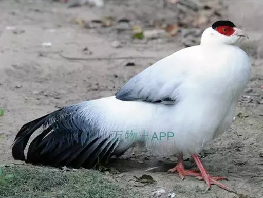 白马鸡雄鸟头顶密被以黑色绒羽状短羽;耳羽簇白色,向后延伸成短角状,但不突出于头上。上下体羽几纯白色,羽端分散呈发丝状。背微沾灰色;颏、喉沾棕,较长的尾上覆羽和翅上覆羽稍沾暗灰色,初级覆羽内翈暗褐色;外翈暗灰褐色而具白色羽缘,次级飞羽黑褐色而具紫色光彩;初级飞羽和小翼羽暗褐褐色;尾特长,辉绿蓝色,基部灰色,末端具带金属光泽的暗绿和蓝紫色;中央一、二对尾羽大部羽枝分散下垂。 雌鸟和雄鸟相似,但体型稍小,羽色较暗淡。 虹膜橙黄色,脸部裸出,呈鲜红色,具疣状小突;嘴粉红色;脚,趾红色,爪角色。雄鸟具距。