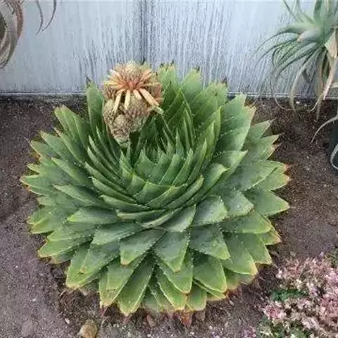 株高可达25-30m或更高,胸径可达4m以上,树皮粗糙坚硬,灰褐色或深褐色,茎基部具明显膨大或有片状支柱根,是最大的芦荟之一。树冠宽伞形,叉状分枝极多;叶条状披针形,聚生枝端,莲座状排列;叶肉质坚韧,大型,深绿色或墨绿色,内弯,边缘有白色齿刺,长70(90)-110(130)cm,平展宽13-15cm。冬季开花,花葶从上部叶腋抽出,通常2-4分枝;总状花序大型,花数十朵密生,管状,淡粉红色或淡橘红色,先端绿色,在绿叶的衬托下格外引人注目。树干粗壮,树形优美,枝叶之间,群花盛开,优雅动人,可作为珍贵的庭园观赏树。
