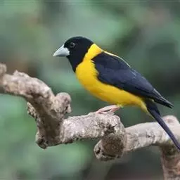 黄颈拟蜡嘴雀:小型鸟类,体长20-22厘米。嘴粗大,黑色。雄鸟整个头、颈、颏、喉和上胸辉黑色,…