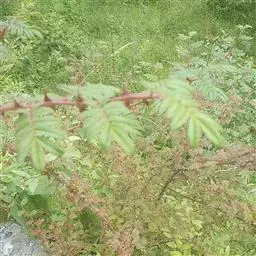 灌木,高3-5米,有长匍枝;小枝有短扁、弯曲皮刺或无刺。小叶通常5,近花序小叶片常为3,连叶柄长9-14厘米;小叶片长圆形、卵形、椭圆形或椭圆状卵形,长3.5-9厘米,宽1.5-5厘米,先端长渐尖或尾尖,基部近圆形或宽楔形,边缘有锐锯齿,两面均无毛,下面中脉突起;小叶柄和叶轴无毛,有散生小皮刺;托叶大部贴生于叶柄,离生部分披针形,先端渐尖,全缘,无毛,或有稀疏腺毛。
