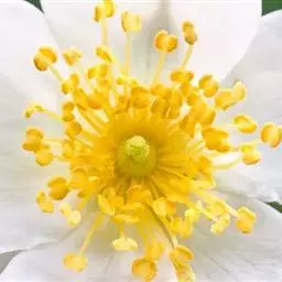 花5-15朵,成伞形伞房状花序;花直径3-4厘米;花梗和萼筒无毛,有时具腺毛,萼片披针形,先端渐尖,全缘,有少数裂片,外面近无毛而有稀疏腺点,内面有长柔毛;花瓣白色,宽倒卵形,先端微凹,基部宽楔形;花柱结合成柱,被柔毛,比雄蕊稍长。果近球形,直径8-10毫米,成熟后褐红色,有光泽,果梗有稀疏腺点;萼片脱落。