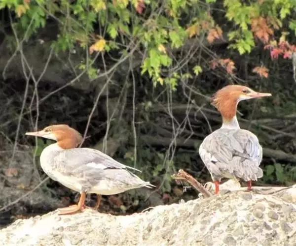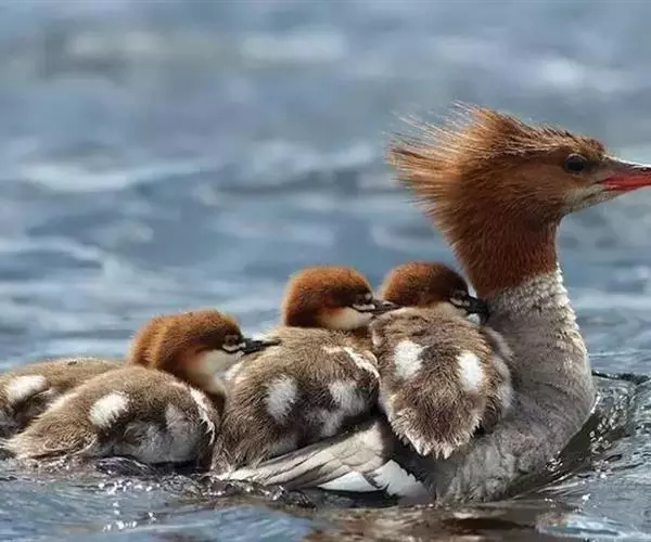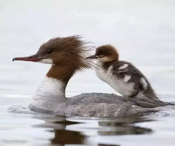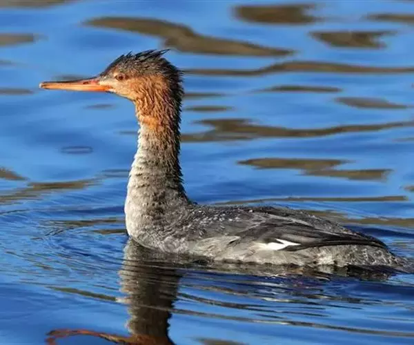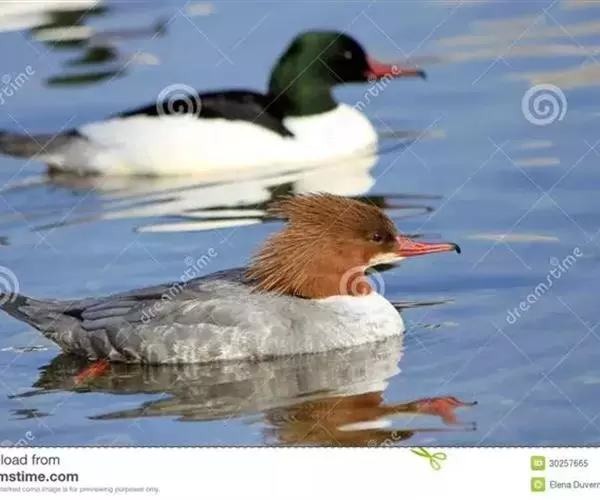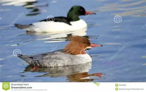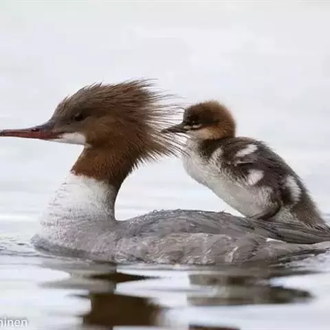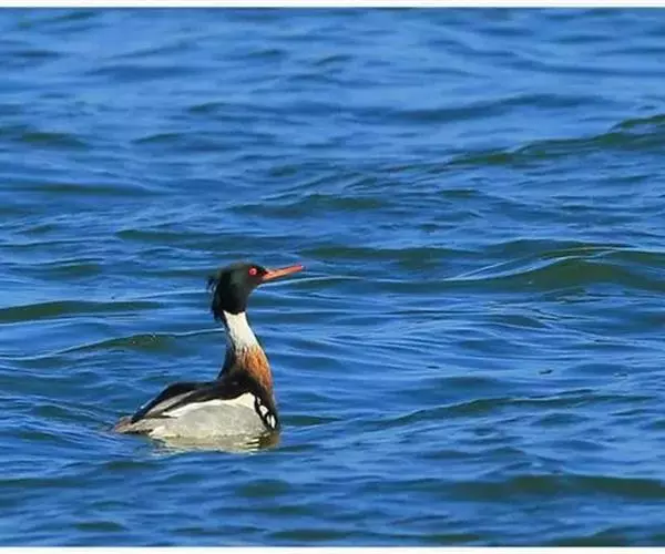 红胸秋沙鸭(学名:Mergus serrator)属中等食鱼鸭类,体长53厘米。嘴细长而带钩,捕食鱼类。丝质冠羽长而尖。雄鸟黑白色,两侧多具蠕虫状细纹。雌鸟及非繁殖期雄鸟色暗而褐,近红色的头部渐变成颈部的灰白色。生活于河流,湖泊,海洋,苔原。常成家族群或小群迁飞,偶尔也见有单只的。食物主要为小型鱼类,也吃水生昆虫、昆虫幼虫、甲壳类、软体动物等其他水生动物。偶尔也吃少量植物性食物。分布于全北界、印度、中国,越冬于东南亚。