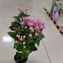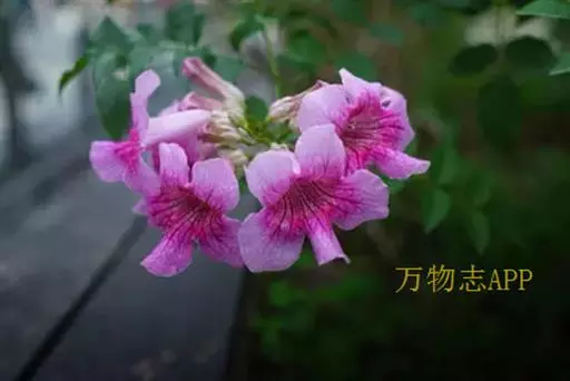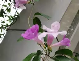 常绿攀援木质藤本,蔓长4~10米,无卷须。复叶,对生,小叶长卵形,小 叶7~11枚,叶柄短。先端尖,基部圆形,叶缘具锯齿。花冠筒状,粉红至淡紫色,冠喉白色,蒴果线形,种子扁平。花期11~6月。