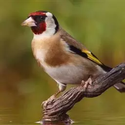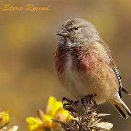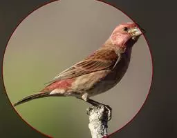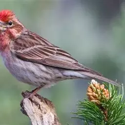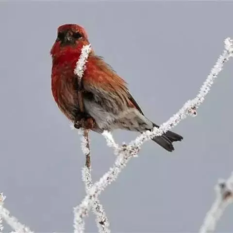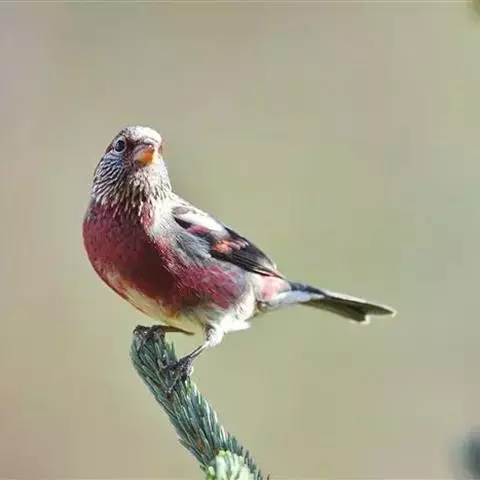 红腰朱雀:体长12-14厘米,小型鸟类。雄鸟前额和眉纹玫瑰粉红色,头顶和一宽的贯眼带深红褐色,背红…