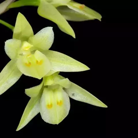 总状花序2至数个,生于茎中部以上具叶和落了叶的老茎上,通常具1-3花;花序柄长3-5毫米;花苞片干膜质,浅白色带褐色斑块,卵形,长3-4(-8) 毫米,宽2-3毫米,先端钝;花梗和子房纤细,长1-2.5厘米;花黄绿色、白色或白色带淡紫红色,有时芳香;萼片和花瓣相似,卵状长圆形或卵状披针形,长 (1-) 1.3-1.7 (-2.3) 厘米,宽 (1.5-) 3-4 (-8) 毫米,先端锐尖或钝,具5条脉;侧萼片基部歪斜而贴生于蕊柱足;萼囊圆锥形,长4-5毫米,宽约5毫米,末端钝。