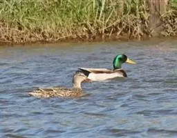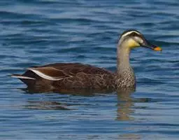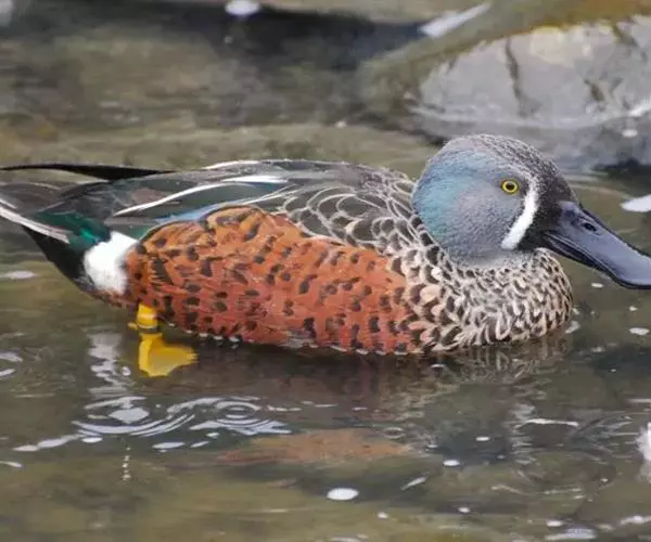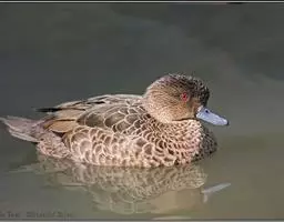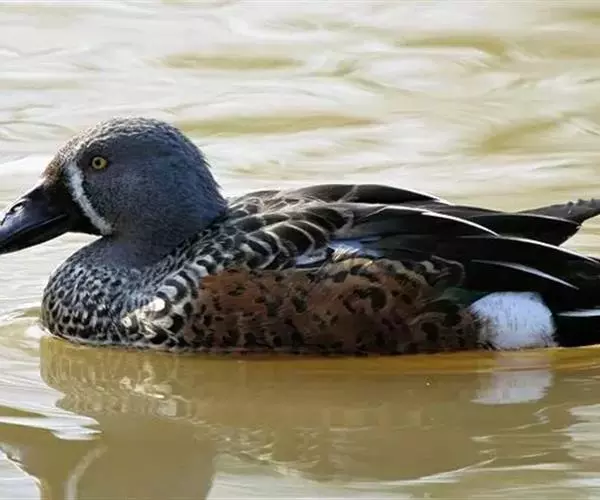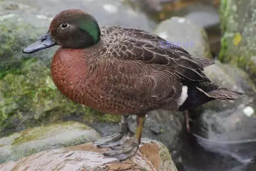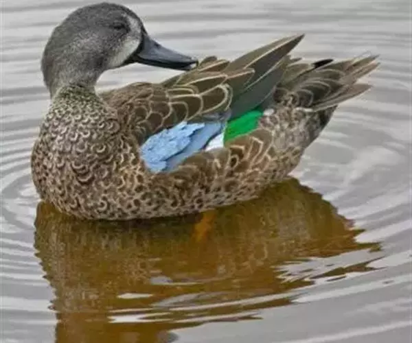 蓝翅鸭(图2) 蓝翅鸭身长37- 41 cm,翼展60 - 64 cm,雄鸭体重273 -410 、雌鸭体重266 - 375 g。是小型的长嘴涉禽。头部是灰色,白眼圈,白眼纹和眼先。体羽红褐色,羽毛有白色镶边。尾覆羽有黑白两色相杂,侧翼有深蓝色翼镜标记。雌鸭和幼鸭体羽是斑驳的褐色,脚黄色,鸭嘴黑色。在繁殖期雄鸭的体羽中有小暗斑。