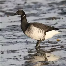 黑雁是雁形目鸭科黑雁属鸟类,又称黑鹅。头、颈、胸、嘴及脚黑褐色;虹膜褐色;背及两翼灰褐色;尾下覆羽白色;胸侧及胁部多近白色纹;颈部两侧各具一个特征性白色横纹,在颈前后断开,未能联成颈环。幼鸟颈部无白斑,而翅上多白色横纹。黑雁繁殖于北美洲、西伯利亚极地的苔原冻土带,越冬于南方沿海的草地及河口。在中国安徽也能见其身影。主要栖息在海湾、海港及河口等地,在冬季里大多出现在有耐碱植物生长的湖泊和水库周围,也出现在周围地势低洼的咸水湖和沿海地区,偶尔还出现在农田地里。性活跃,喜集群,常成群活动和栖息。主要以植物性食物为食。繁殖期在6-8月,雌鸟孵卵,雄鸟通常在距巢100米以内范围内守候警诫。雌鸟孵卵时常将头和颈朝地面平伸出去以降低高度。孵化期为22-28天。黑雁被列入中国林业局2000年8月1日发布的《国家保护的有益的或者有重要经济、科学研究价值的陆生野生动物名