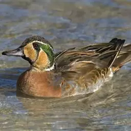 蓝翅鸭(学名:Anas discors)是雁形目、鸭科的鸟类。身长37- 41 cm,头部灰色,眼圈、眼纹和眼先均灰白色。体羽红褐色,羽毛有白色镶边。侧翼有深蓝色翼镜标记。栖息于淡水湖畔,亦有些越冬活动于沿海滩涂盐场、水库、湖池、河流,小溪,沼泽,湿地,稻田,甚至农田。冬季喜集群生活。活动多选择在水边沼泽地区的野草丛间。常成群活动于江河、湖泊、海湾和海岸等水域,以草籽、稻谷、螺、软体动物为食。 分布于北美地区和南美洲。