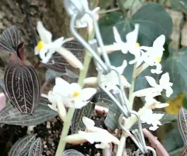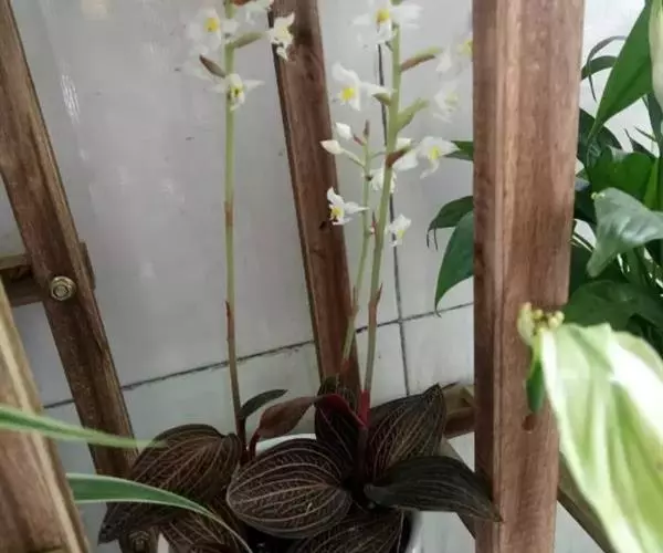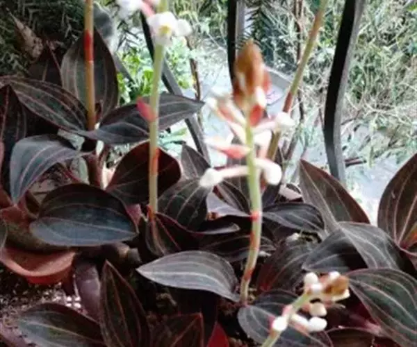 血叶兰(学名:Ludisia discolor (Ker-Gawl.) A. Rich.):植株高10-25厘米。根状茎伸长,匍匐,具节。茎直立,在近基部具3-4枚叶。叶片卵形或卵状长圆形,上面黑绿色,具5条金红色有光泽的脉,背面淡红色;叶之上的茎上具2-3枚淡红色的鞘状苞片。总状花序顶生,具几朵至10余朵花;花白色或带淡红色,直径约7毫米;花瓣近半卵形,长8-9毫米,宽2-2.2毫米,先端钝。花期2-4月。