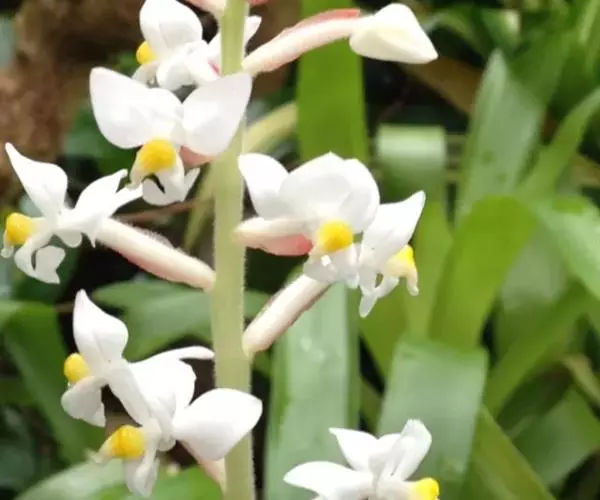 总状花序顶生,具几朵至10余朵花,长3-8厘米,花序轴被短柔毛;花苞片卵形或卵状披针形,带淡红色,膜质,长约1.5厘米,先端渐尖,边缘具细缘毛;子房圆柱形,扭转,被短柔毛,连花梗长1.5-2厘米;花白色或带淡红色,直径约7毫米;中萼片卵状椭圆形,凹陷呈舟状,长8-9毫米,宽4.5-5毫米,与花瓣粘合呈兜状;侧萼片偏斜的卵形或近椭圆形,长9-10毫米,宽4.5-5毫米,背面前端有很短的龙骨状突起。
