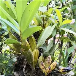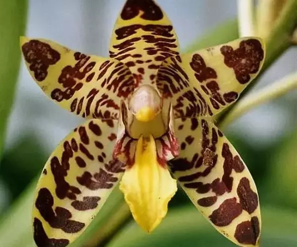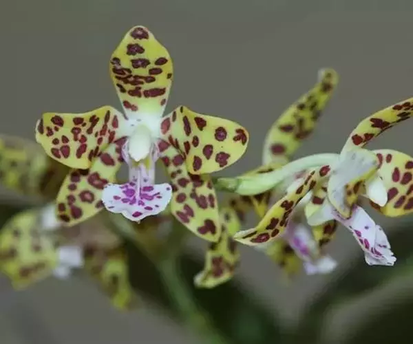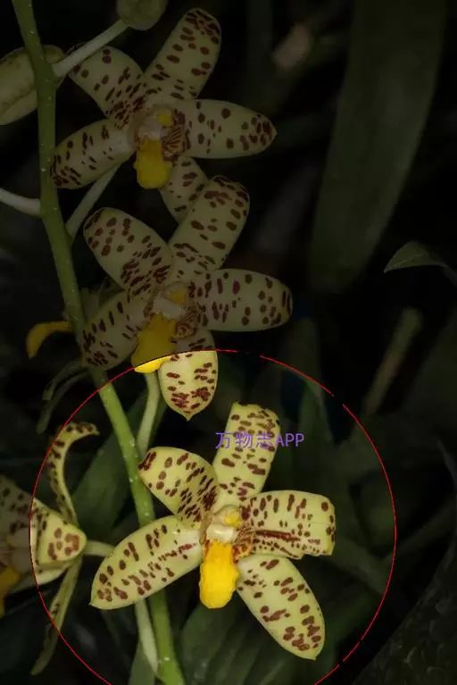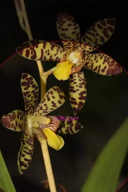 花序1-6个,长达35厘米;花序柄粗壮,长5-17厘米,粗4-6毫米,被3-4枚鞘;花序轴长约为花序长的1/3-1/2,疏生5-8朵花;花苞片大,宽卵形,长1.2-1.5厘米,宽7-10毫米,先端钝;花梗和子房长3-4厘米;花大,稍肉质,萼片和花瓣黄色带暗紫色斑点;萼片近相似,近宽倒卵形,长2-2.6厘米,宽1.2-1.5厘米,先端钝,具10条脉,在背面中肋隆起呈龙骨状。