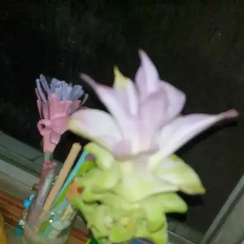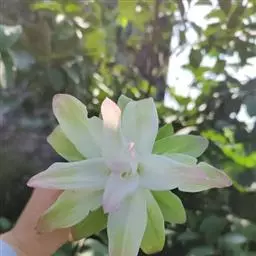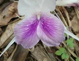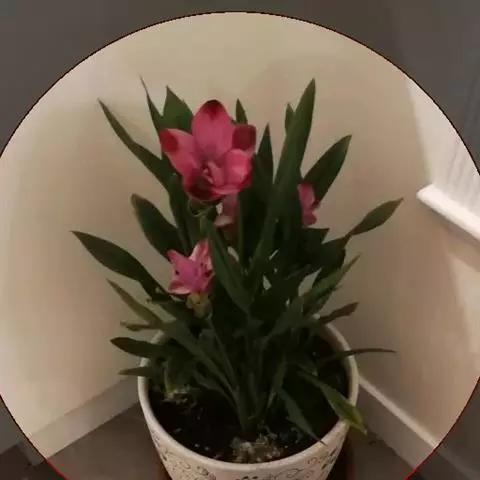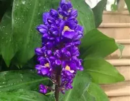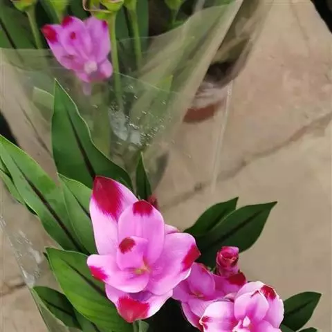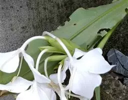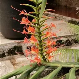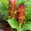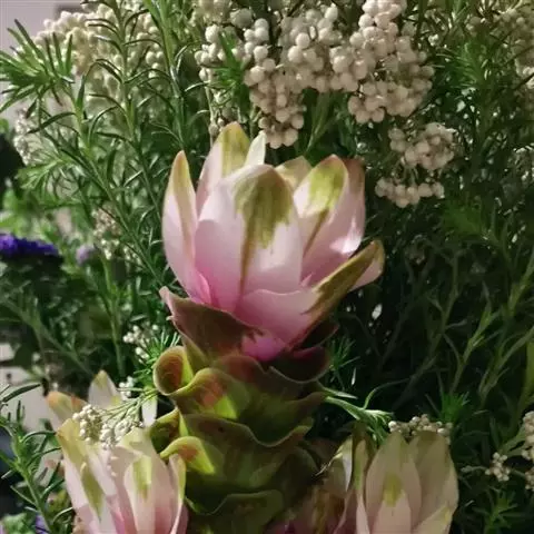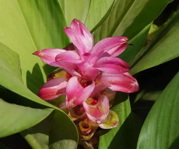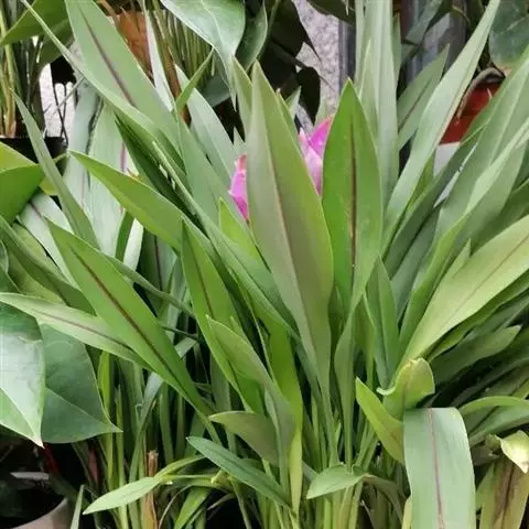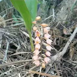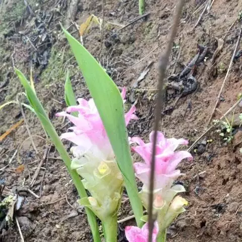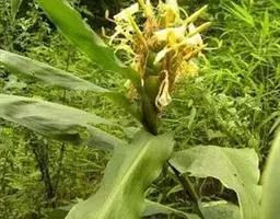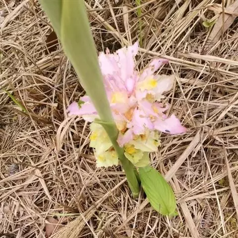 穗状花序从根茎抽出,和具叶的营养茎分开;总花梗长7-14厘米,花序长约15厘米,直径约7厚米;花序下部的苞片阔卵形,长约4厘米,先端平展,淡绿色,上部的苞片长圆形,斜举,淡红色;花生于下部和中部的苞片腋内;花萼白色,长约1厘米,一侧裂至中部,先端有3钝齿;花冠管长2厘米,喇叭状,喉部密生柔毛,花冠裂片3片,卵形,长约1厘米,后方的1枚较宽,宽约9毫米,先端尖,略成兜状,两侧的稍狭;侧生退化雄蕊长圆形,与花冠裂片近等长;唇瓣近圆形,淡黄色,先端3浅圆裂,中部裂片稍长,先端2浅裂;花丝扁阔,花药狭长圆形,长约4毫米,药室紧贴,基部有距;花柱丝状,无毛,柱头头状,具缘毛;子房被长柔毛。花期5-7月。