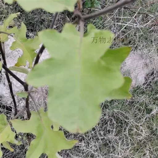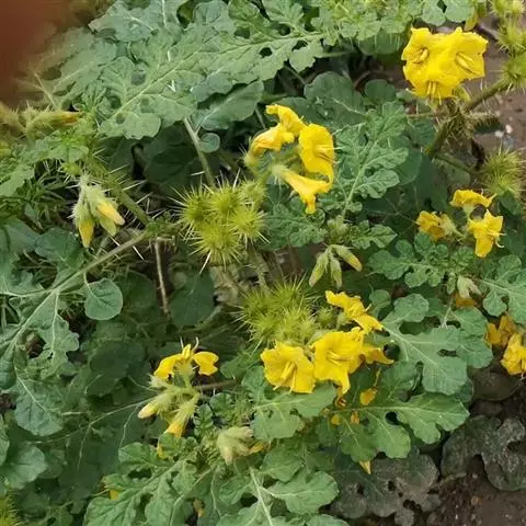 灌木,高1-2(3)m,小枝,叶下面,叶柄及花序柄均被具长柄,短柄或无柄稍不等长5-9分枝的尘土色星状毛。小枝疏具基部宽扁的皮刺,皮刺淡黄色,基部疏被星状毛,长2.5-10mm,宽2-10mm,尖端略弯曲。叶单生或双生,卵形至椭圆形,长6-12-(19)cm,宽4-9-(13)cm,先端尖,基部心脏形或楔形,两边不相等,边缘半裂或作波状,裂片通常5-7,上面绿色,毛被较下面薄,分枝少(5-7)的无柄的星状毛较多,分枝多的有柄的星状毛较少,下面灰绿,密被分枝多而具柄的星状毛;中脉在下面少刺或无刺,侧脉每边3-5条,有刺或无刺。叶柄长约2-4cm,具1-2枚皮刺或不具。