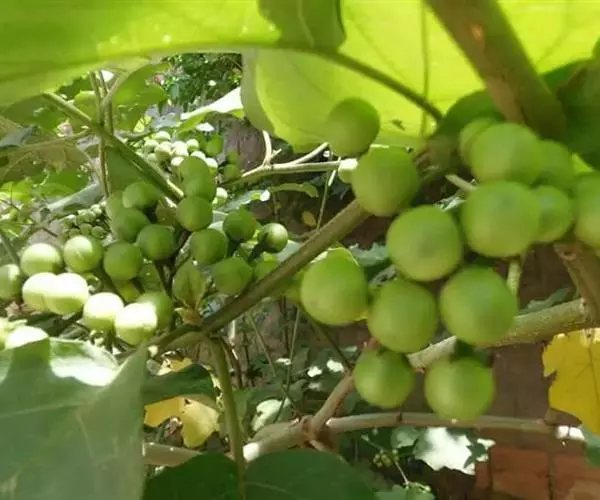浆果黄色,光滑无毛,圆球形,直径约1-1.5cm,宿萼外面被稀疏的星状毛,果柄长约1.5cm,上部膨大;种子盘状,直径约1.5-2mm。全年均开花结果。