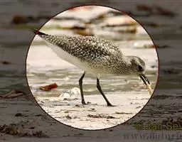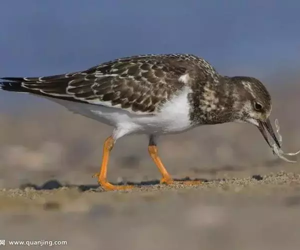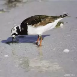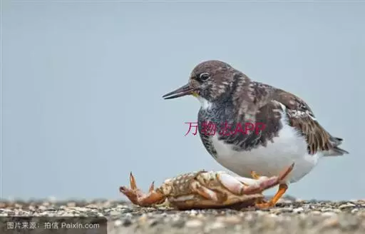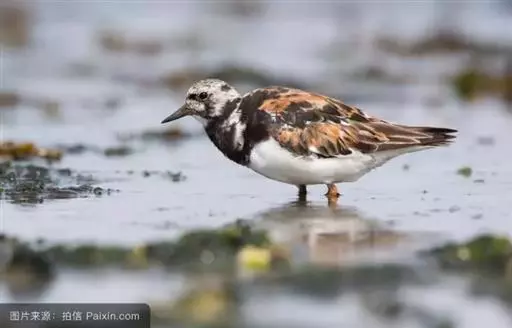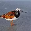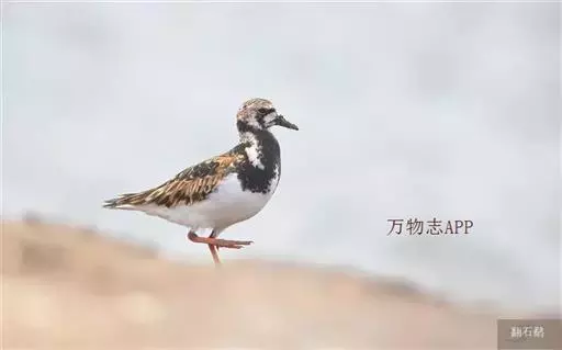 翻石鹬全貌特征 雄鸟夏季头颈白色,头顶与枕具细的黑色纵纹;前额白色,有一黑色横带横跨于两眼之间,并经两眼垂直向下,与黑色颚纹相交。眼先、耳覆羽和喉白色,胸和前颈黑色,两端分别向颈侧延伸,形成两条带斑;前端与黑色颚纹相联,使喉仅中部为白色。其余下体纯白色。背、肩橙红色,具黑、白色斑;下背和尾上覆羽白色,腰具一黑色横带;尾黑色,外侧5对尾羽具窄的白色尖端;初级飞羽黑褐色,羽轴白色,内侧初级飞羽基部白色;大覆羽黑色,具白色端斑,外侧次级飞羽基部也为白色,端部黑色;内侧次级飞羽白色,具黑色端斑;在翅上形成明显的白带。三级飞羽橙栗色,具黑色斑纹;小翼羽及初级覆羽黑色;中覆羽赤褐色;内侧翅覆羽和三级飞羽基部白色,在翅基部形成三角形白斑;雌鸟和雄鸟基本相似,但上体较暗,多为暗赤褐色,头部黑色纵纹较多。冬羽和夏羽相似,但上体橙栗色大多消失,变为暗褐色。背部和胸部黑色变为黑褐色。黑白斑驳也不甚明显。幼鸟似成鸟冬羽,但上体体色更暗,多为褐色,具皮黄白色羽缘。