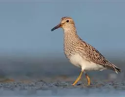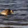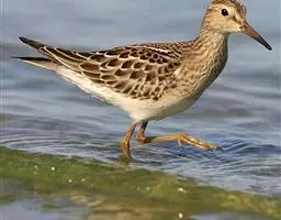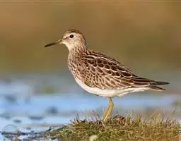 阔嘴鹬是涉禽,体长17厘米。特征为翼角常具明显的黑色块斑并具双眉纹。与黑腹滨鹬平滑下弯的嘴相比,…