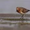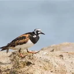 翻石鹬(学名:Arenaria interpres)体型高矮兼称,看起来十分的滑稽。它们在繁殖季时体色非常醒目,由栗色、白色和黑色交杂而成,嘴短,黑色,脚橙红色。到了冬天,翻石鹬身上的栗红色就会消失,而换上单调且朴素的深褐色羽毛。翻石鹬为台湾普遍的过境鸟,但是以春过境期较容易见到。它们在台湾中南部以及金门、澎湖等离岛都可以发现。平时喜欢栖息在潮间带、河口沼泽或是礁石海岸等湿地环境,主要以藏身其下的沙蚕、螃蟹等小动物为食。在中国为旅鸟和冬候鸟。春季于4-5月,秋季于9-10月迁徙。迁徙时常集成松散的大群。