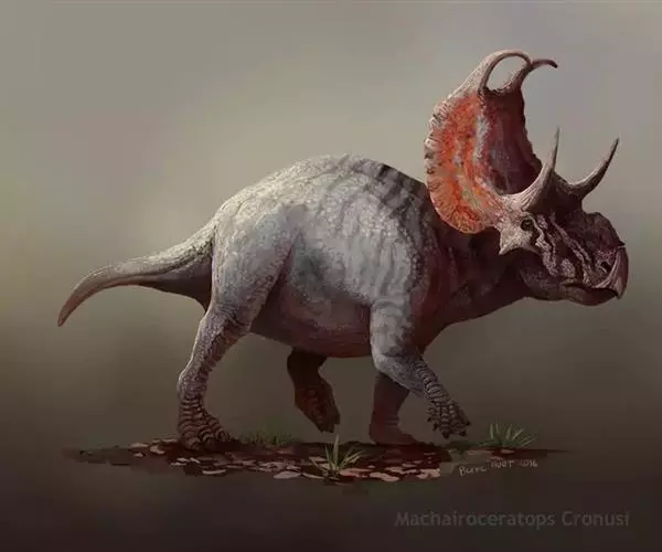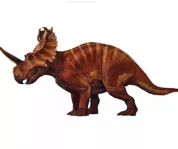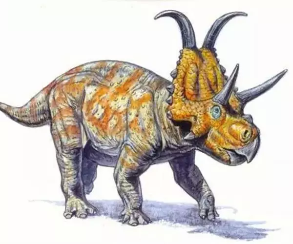 牛角龙是生活在白垩纪晚期的草食性恐龙,距今约7000万年前的北美洲,体长约8米。它有一个巨大的脑袋,脑袋后部还有一个色彩艳丽的超大头盾,眼睛上面有两只大尖角,鼻子旁还有一个小角。是用四条腿行走的草食性恐龙。